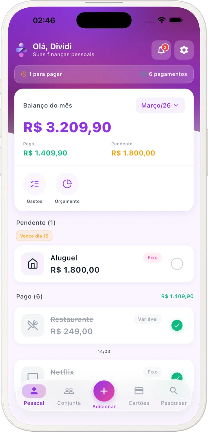 Gastos pessoais e compartilhados em um só app